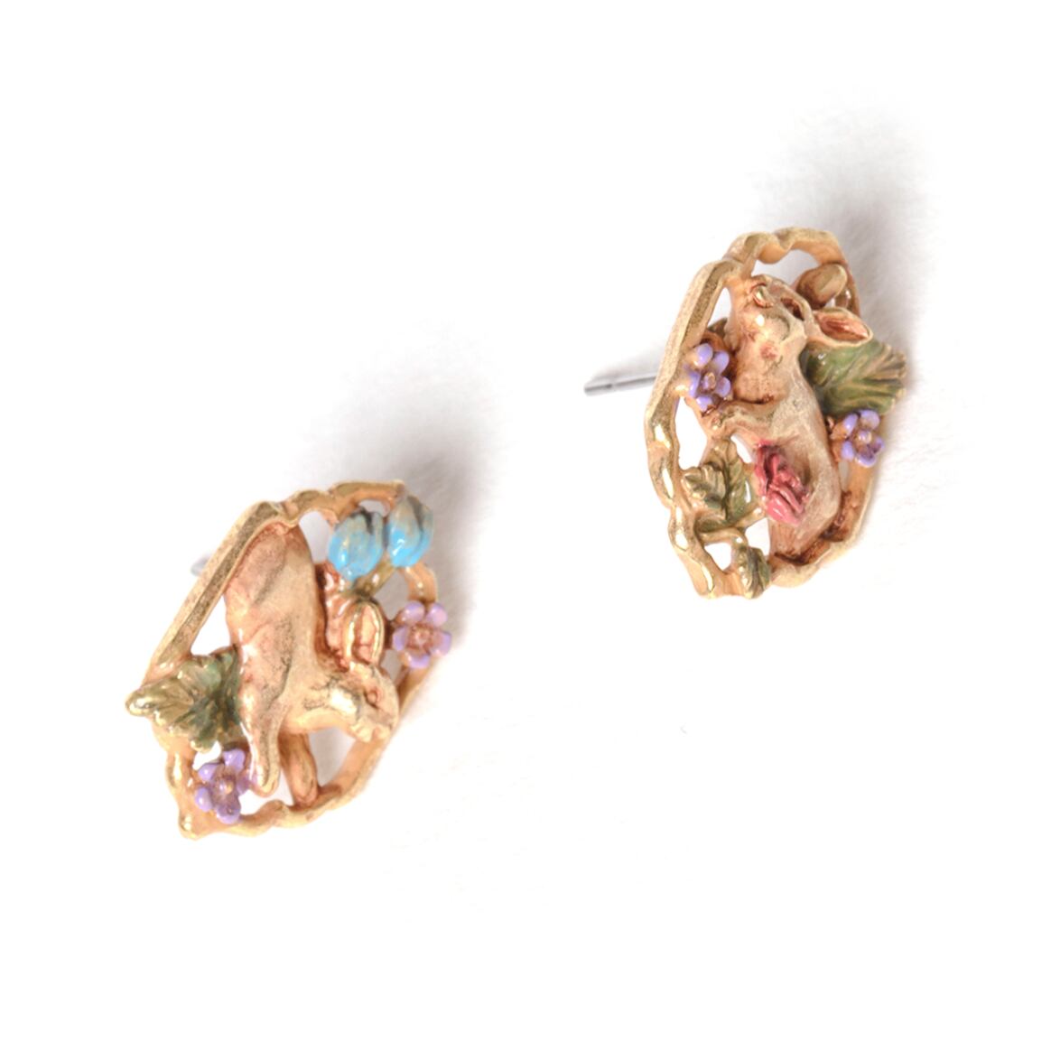 季節を問わずいろんな花が咲いている不思議な花園で野うさぎ達が遊んでいる様子がデザインされたピアスです。