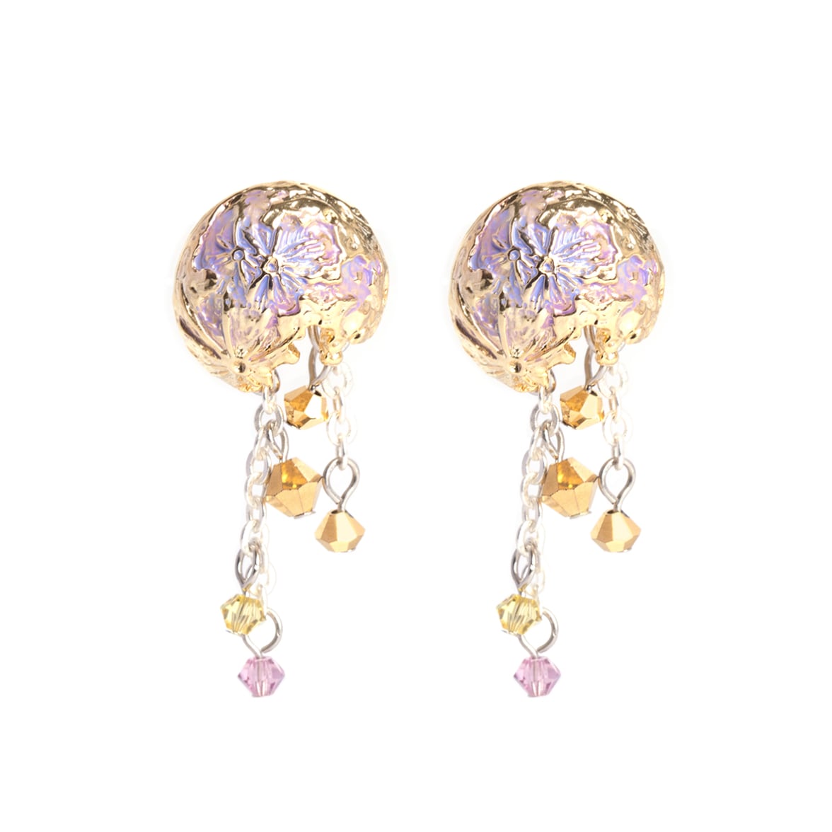 少しずつこぼれ落ちていくようにチェーンの先でゆらゆらと揺れるビーズは、月の一部であったことを主張するかのようにパープルやピンクに美しく輝いています。