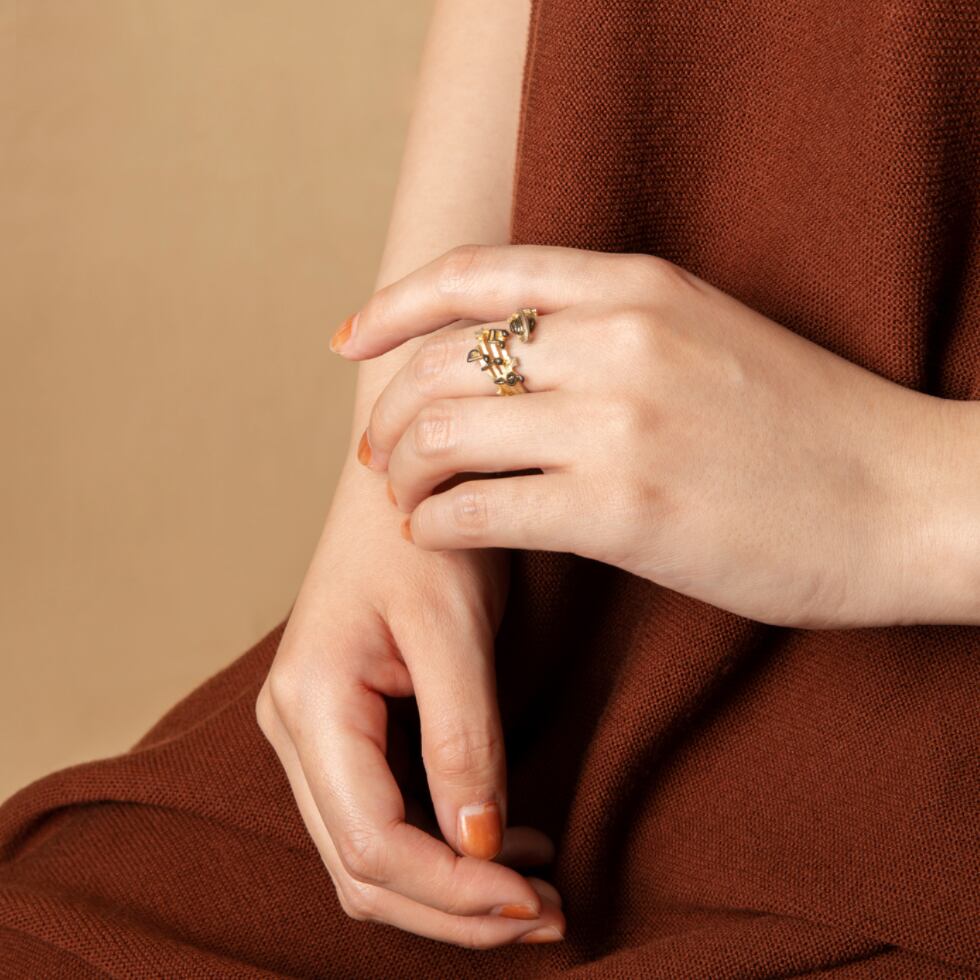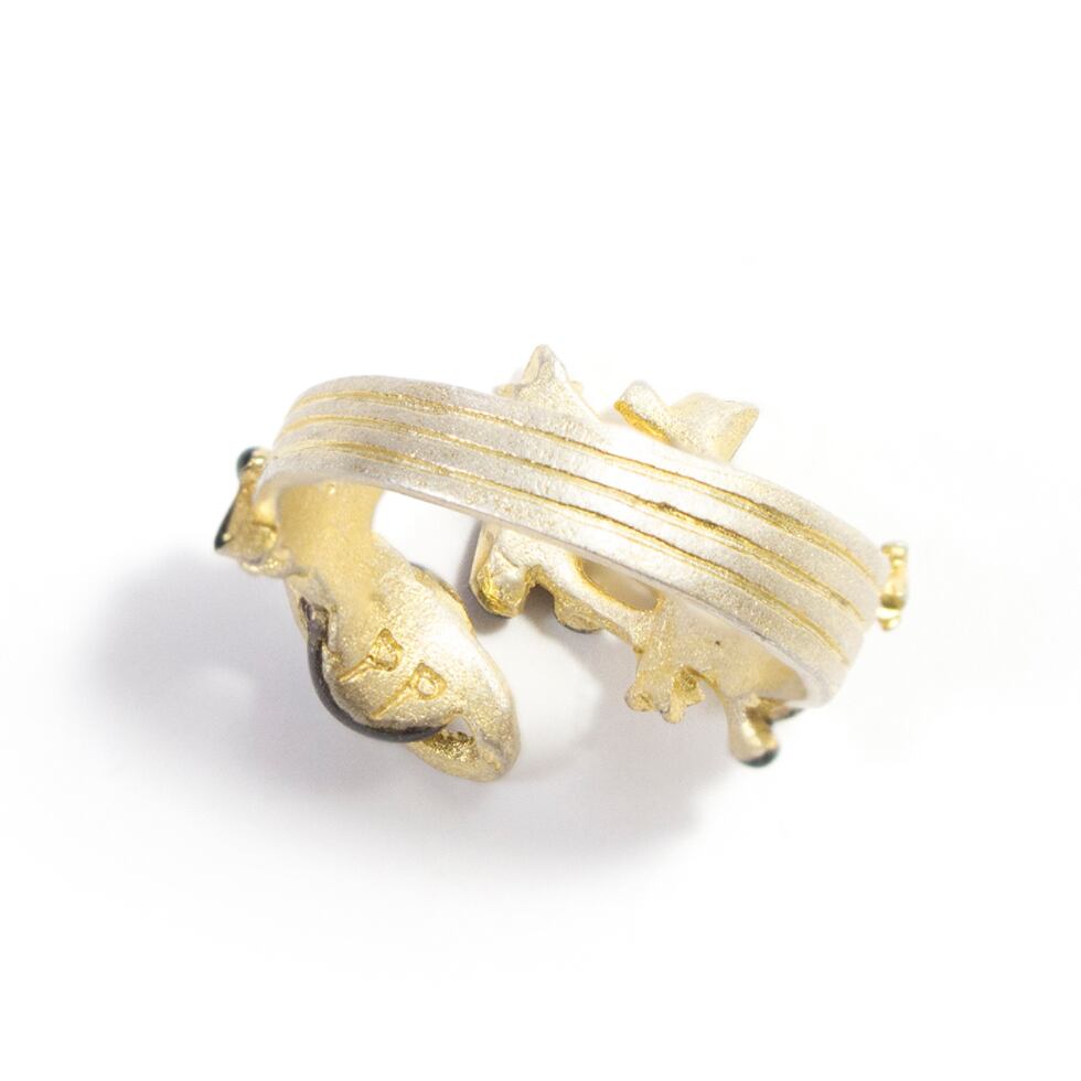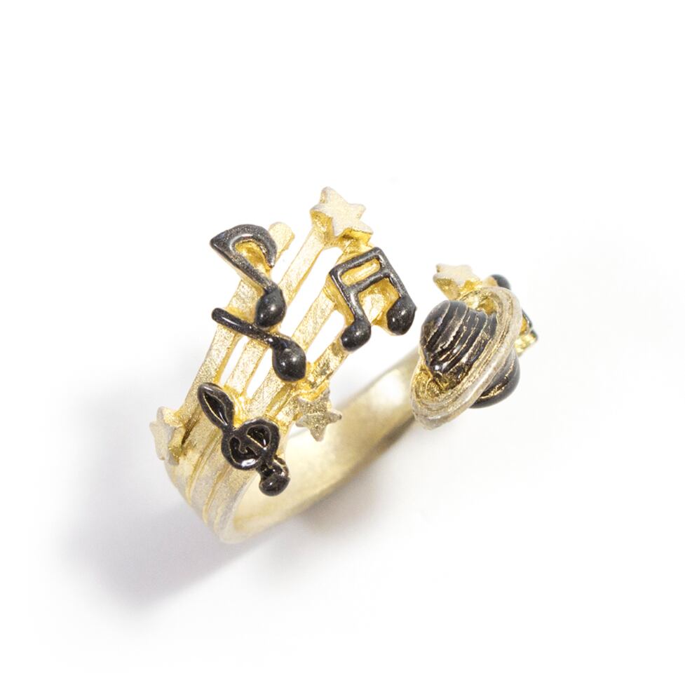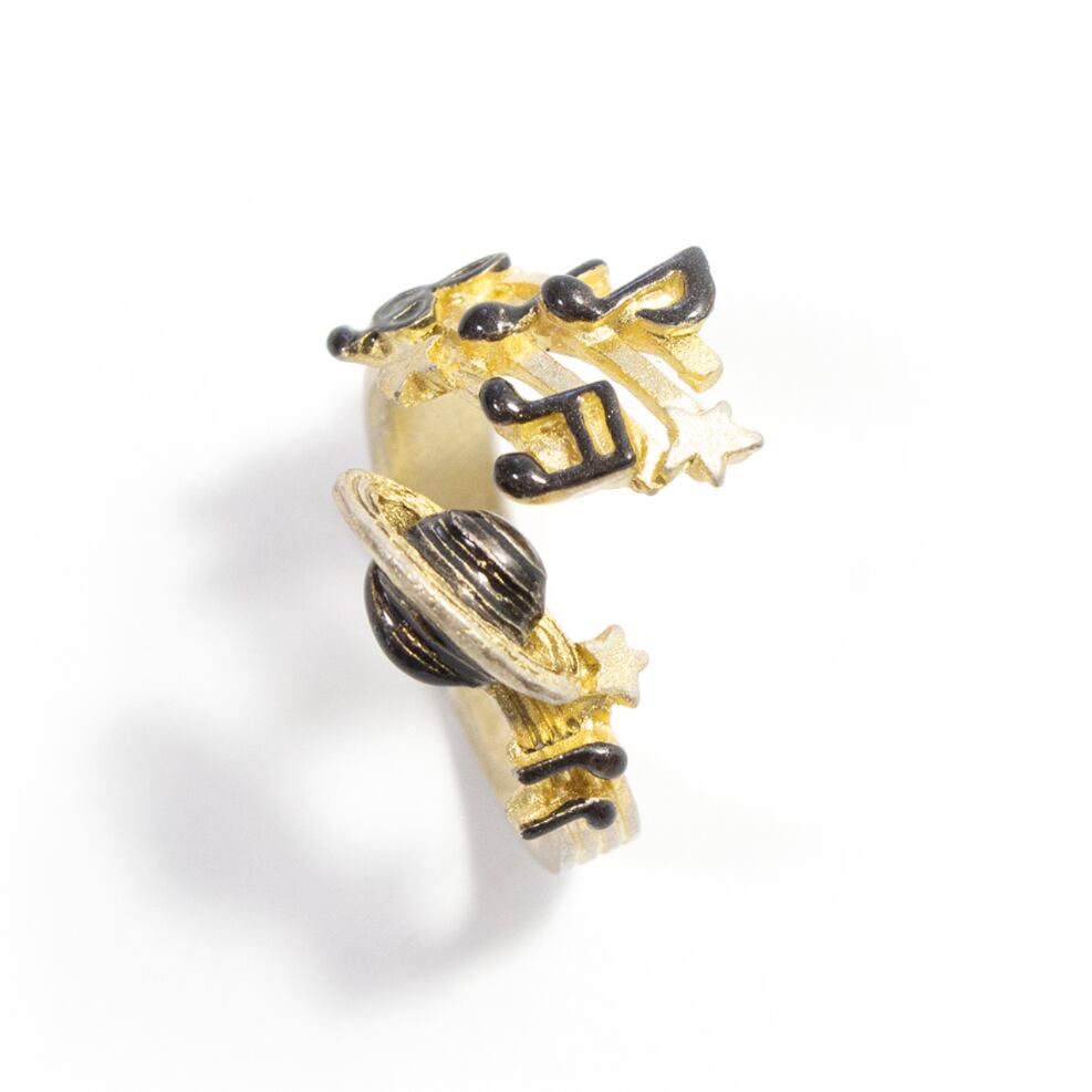 土星から聞こえてくるにぎやかな音楽をイメージしたリング。五線譜が広がって楽し気な音色が宇宙に拡散されています。星たちもキラキラと瞬きながら踊りだしそう!土星の右に並んだ音符はパルナートポックの「PP」の意味が込められています。土星はかつて太陽系の最果ての星と言われていたこともあり淡々とした暗いイメージを持たれますが、肉眼で見ることができるくらい明るく輝く星です。実は賑やかな一面も持っているのかもしれませんね。