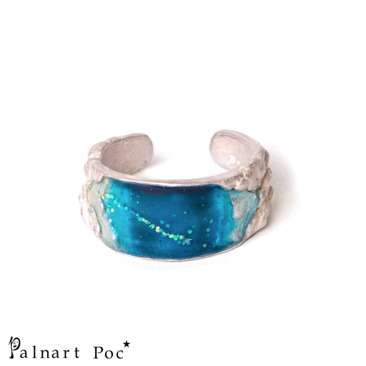 飛行機の窓から見える景色をデザインしたリング、果てしなく広がる空から成層圏の様子が色を何層も重ねて表現された繊細なアイテムです。