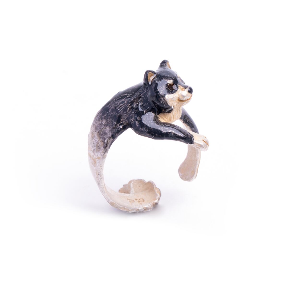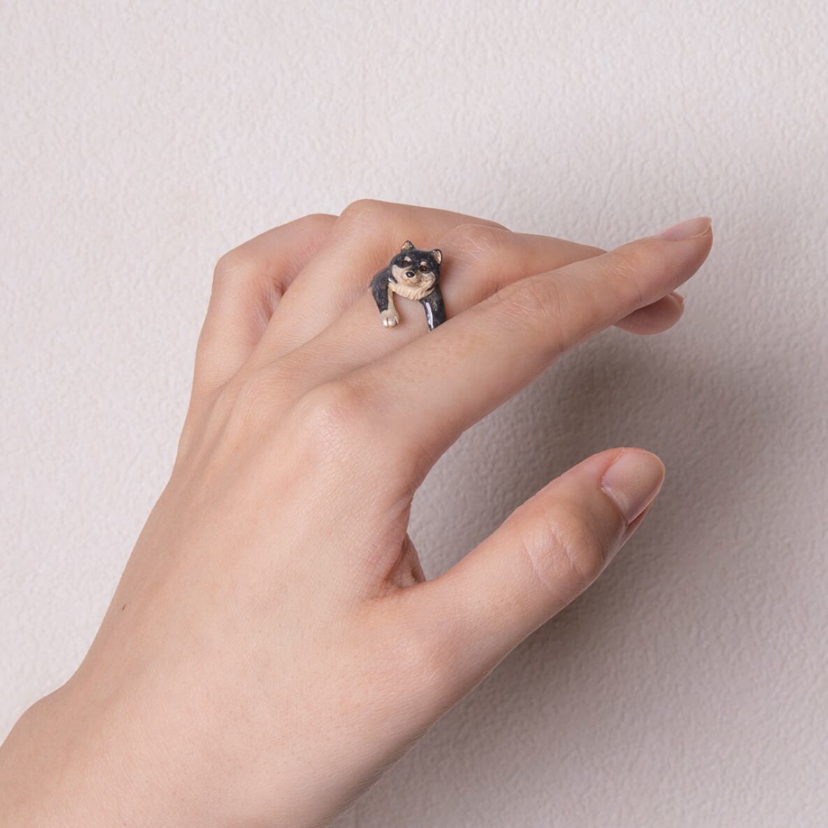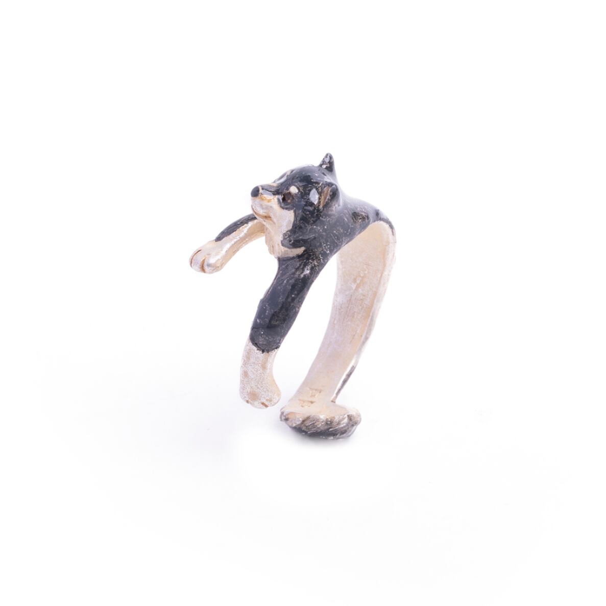 抱っこされた柴犬の姿をモチーフにしたリング。